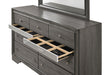 ACME Naima Dresser, Gray, 63" x 17" x 39"H, 137lbs. Features: - 9 Drw (Jewelry Drawer) - Casegood Drawer: GLIDE Center Metal, Dovetail English Front & Back, Fully Finished Inside (Full Ext. & Felt-Lined Only for Jewelry Drawer), Hardware: Chrome Finish Materials: Wood, Acrylic Trim, Veneer, Composite Wood