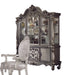 ACME Versailles Hutch & Buffet, Antique Platinum (1Set/2Ctn), 75" x 22" x 94"H, 450lbs. Features: - Hutch & Buffet w/Touch Light - Hutch 2 Glass Doors, Buffet 3 Drw & 2 Wooden Doors - Oversized Scrolled Trim w/Leaf Crown Motif, and Post-Leg (Poly Resin with Antique Contrast Finish) - Drawer: Glide Side Metal, Dovetail English, Felt-Lined Drawers Materials: Wood, Poly Resin, Glass, Mirror, Wood Veneer